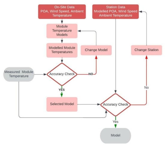 Alongside the incident irradiation, power output of PV modules is also temperature dependent. Manufacturers generally provide the effect of temperature as %/°C on parameters such as Pmax, Voc and Isc. Depending on the selected performance metric module temperature or cell temperature needs to be modelled since direct measurements are not available [21,23]. The module temperature model selection procedure is provided in Figure 2.