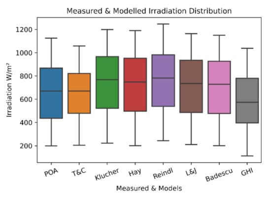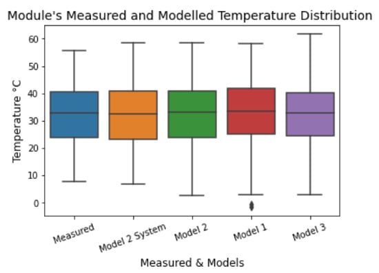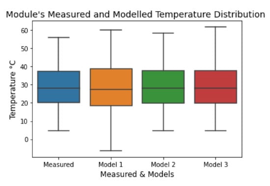 On-site measurements including ambient temperature, wind speed, and measured irradiation is used for the assessment of models for predicting the module temperatures. Boxplot of measured and modelled module temperatures are provided in Figure 4.