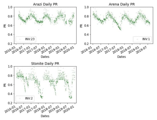 The systems investigated between 2016 and 2020 covered a period of 4 years, for the venues Arena, Stonite and Arazi. Almost 1 MWp of polycrystalline PV modules wired to total number of 42 SMA 25,000 TL inverters are investigated. In Arazi, the installation two of the inverters, INV:6 and INV:22, are not considered in this study due to failure to generate any power over a year. The annual averaged daily PR for venues Arena, Arazi and Stonite is 0.79, 0.76 and 0.74, respectively. Our findings are in agreement with the findings of Makrides et al., in Arena installation [31]. While two venues have relatively lower PRs. Randomly selected daily PR plots of different inverters, INV 23 from Arazi, INV:1 from Arena and INV:2 from Stonite are presented in Figure 7, respectively. PR plot for Stonite installation differs from the Arazi and Arena PR plots as the modules undergo heavy soiling, occuring from June to October repeatedly over the years. In 2016, a reduction trend of PR started in June by the end of July PR amount to 0.55 and by mid-August lowest PR is registered as 0.43. Similar patterns were observed over the years. The lowest PR was registered as 0.29 in October 2017. Similar excessive reduction in PR values was observed for Arena installation, though only in 2017. Gradual reduction in PR values observed in 2017, starting in summer until mid-October. The lowest daily PR recorded as 0.49 on 15th October and registered PR values was around 0.5 for a week. Further though the end of October PR values increased back to 0.7, indicating possible cleaning of the modules. During the rest of the year, daily PR remained above 0.60. Dissimilar from previous two venues, the Arazi daily PR plot remained above 0.6 throughout the analyzed years. Considering installation angles of the venues, drops in PR plots may link to the soiling of PV modules. Occasional soiling in Arena installation is observed in the summer of 2017, and severe soiling in Stonite installation throughout the monitoring period due to their lower tilt angle. On the other hand, limited reduction in PR is observed in Arazi installation with a higher installation angle. Severe drop in daily PR plot of Arena during the summer of 2017 may be linked to a rainless period or inadequate rainfall and lack of maintenance during this period. Moreover, severe losses in daily PR values for Stonite installation also may be linked to excess soiling caused by a nearby operating brick factory. The brick factory uses clay, fine grains used for brick production and coal ash from the chimney of furnaces contributing to reductions in PR values.