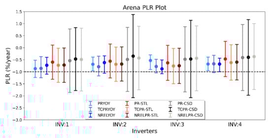 Figure 8 represents PLRs of Arena inverters estimated by various metrics and statistical approaches. In general, YOY approach generated higher PLRs compared to CSD and STL methods. The uncertainty of YOY approach is the lowest. The average PLR of Arena installation from different methods is determined in two ways by grouping degradation rates based on normalization metric and statistical approaches. The PLR of Arena plant based on statistical approaches YOY, STL and CSD are −0.73, −0.65 and −0.44%/year, respectively. The average PLR based on normalized metrics namely PR, TCPR and NRELPR and variable are −0.57, −0.63 and −0.62%/year, respectively. Based on YOY, the averaged PLR of Inverter 1 is −0.82%/year, highest among all the inverters. From STL INV:3 has the highest PLR with 0.71%/year. Both methods suggest INV:4 has the lowest PLR.