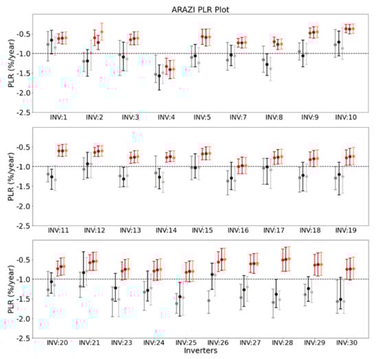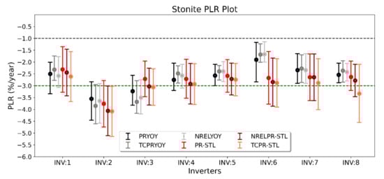 Figure 9 represents PLRs of Stonite inverters estimated by various metrics and statistical approaches for Stonite installation. In general, STL approach generated the higher PLRs than YOY methods. The uncertainty of methods of YOY approach is lower than STL method. The average PLR of Stonite installation is separated into two groups based on normalization metric and statistical approaches. The PLR of Stonite plant, based on statistical approaches YOY and STL, are −2.65 and −2.91%/year, respectively. On the other hand, the average PLR based on normalized metrics PR, TCPR and NRELPR are −2.71, −2.84 and −2.78%/year, respectively.