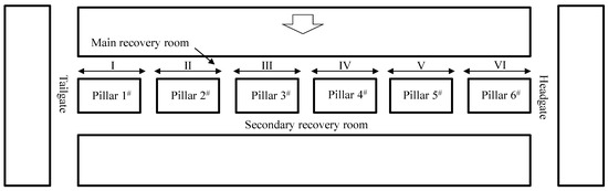 The support parameters and mining conditions of the two panels are illustrated in Table 3. The length of the recovery room in both panels was 300 m. The width of coal pillar between the main and secondary recovery rooms was 20 m. The maximum working resistances of shield and chock hydraulic supports in the two panels were 17,000 kN and 18,000 kN, respectively. Figure 2 shows a plan view of the support design for the main recovery room.