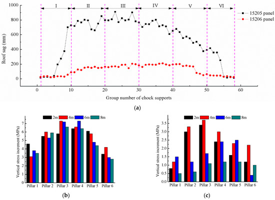 Roof deformation and coal pillar stress monitoring results of recovery room: (a) distribution and comparison of the roof sag of the main recovery rooms in panels 15205 and 15206; (b) field monitoring results of protective coal pillar stress in panel 15205; (c) field monitoring results of protective coal pillar stress in panel 15206.