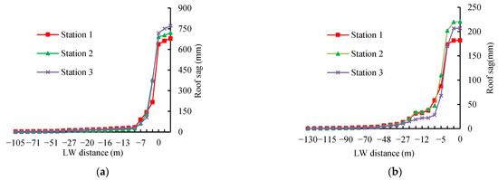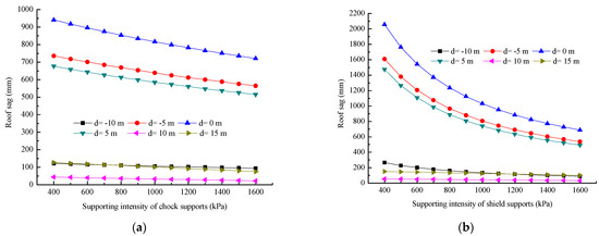 Influence of the supporting intensity of hydraulic supports on the roof sag of recovery room: (a) chock supports; (b) shield supports.