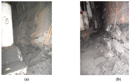 Spalling failure of protective coal pillar in the main recovery room: (a) panel 15205; (b) panel 15206.