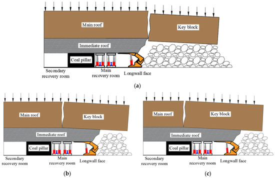 Based on strata behavior observations in Chinese mining practices, when a longwall face enters a recovery room, the main roof could continue to break and collapse. Depending on the main roof break position following the entrance of the longwall face into the main recovery room, three forms of main roof failure can occur [22,24,27,35,36,37], as shown in Figure 7.