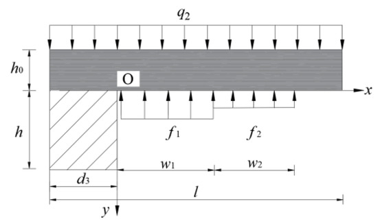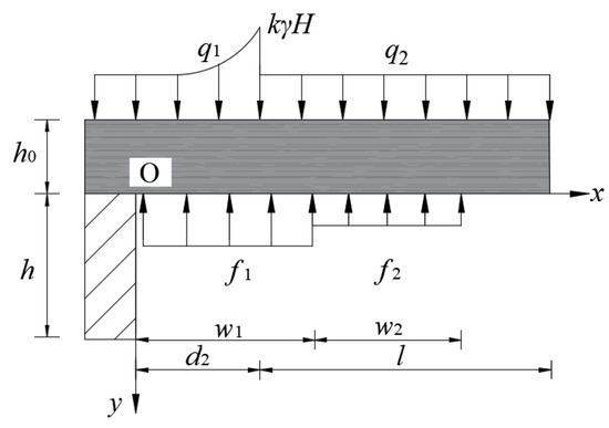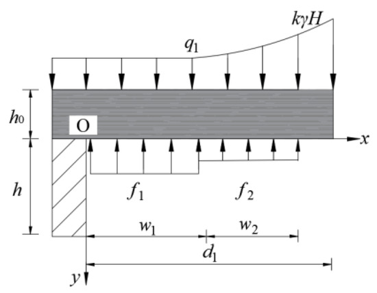 When the main roof breaks behind the shield hydraulic supports, the recovery room roof takes on a cantilever beam structure since the mining rib is completely mined. If the breaking of the cantilever rock beam does continue, immediate roof deflection could be considered as recovery room roof sag. The upper part of the immediate roof bears front abutment pressure and hydraulic supports directly supported the roof. The developed mechanical model is shown in Figure 8 where q1 is front abutment pressure; f1 and f2 are supporting intensities of chock and shield hydraulic supports, respectively; w1 and w2 are the widths of main recovery room and longwall face, respectively; h0 is the immediate roof thickness; h is the recovery room height; and d1 is the break position when the main roof breaks behind shield hydraulic supports.