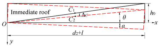 Under the action of the key block, the immediate roof deformations and the center of gravity were also changed. The deformation between the immediate roof and the key block was considered as coordinated, i.e., the rotation angle of the immediate roof was also equal to α. Therefore, according to the geometric relationship of immediate roof deformation shown in Figure 10, the displacement of the center of gravity along the vertical direction Δc is illustrated as [39]: