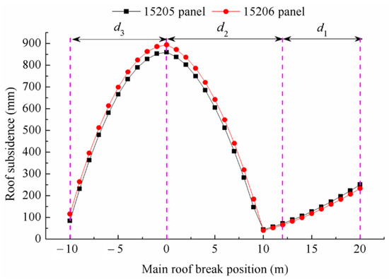 The parameters required for the calculation and analysis are summarized in Table 6. The change rule of recovery room roof sag with main roof break position was obtained by taking break position d as a variable. The value of the main roof break position d is obtained by Equation (26):