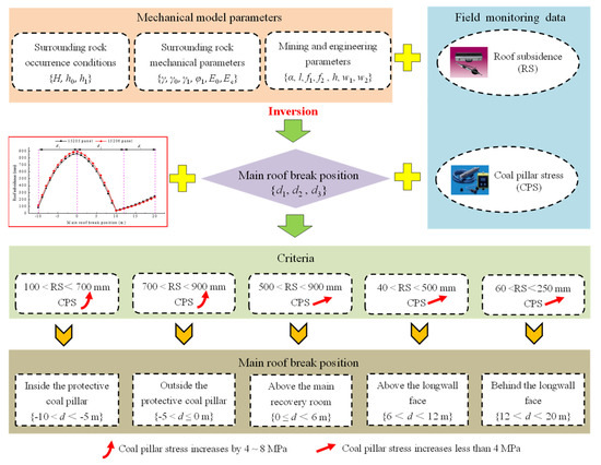 Based on previous analyses, after all relevant parameters were determined, the main roof break position of the recovery room could be calculated according to roof sag. However, as shown in Figure 12, two or three main roof break positions could be obtained based on the inversion calculation of roof sag. If other additional conditions were not considered, such inversion results would be meaningless. In field monitoring, roof sag and coal pillar stress are the most frequently monitored items and relevant data are also the easiest to obtain directly. Therefore, by combining field monitoring data for panels 15205 and 15206 in Hongliulin Coal Mine, we developed a method for the determination of the main roof break position for the recovery room in the 5−2 coal seam, as shown in Figure 14. The inversion discrimination of the main roof break position was divided into three steps: