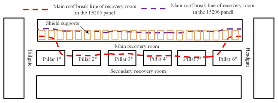 Based on field monitoring data, the main roof break position of each monitoring area in the recovery room for panels 15205 and 15206 was calculated, as presented in Table 7. According to the main roof break position data calculated by inversion, the schematic diagram of the main roof break lines of panels 15205 and 15206 after the entrance of the longwall face into the main recovery room were drawn, as shown in Figure 15. Obviously, the reason for the large deformations in the surrounding rock of the recovery room in panel 15205 was that the main roof break line was above the protective coal pillar, while that in panel 15206 was relatively small because the main roof break line was above the shield support, which was closer to the 12 m calculated by Equation (27).
