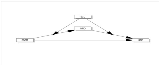 Theoretical Framework. (SSCM—sustainable supply chain management practices, INNO—innovation, SFP—sustainable firm performance, SCL—socio-cultural factors).