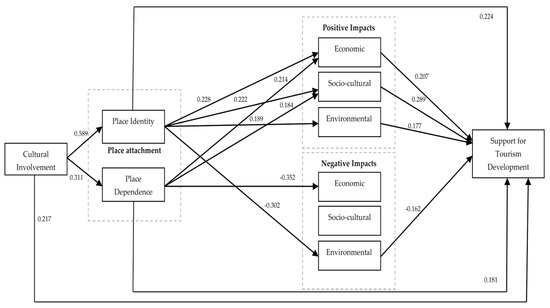 Firstly, the model’s validity was examined, and it showed satisfactory fit indexes (CFI = 0.951; TLI = 0.946; RMSEA = 0.053; SRMR = 0.074). The fit indices were adequate for addressing each latent factor’s postulated interrelationships in the proposed model (Table 4). Cultural involvement regading Place identity (β = 0.589, p < 0.000), Place dependence (β = 0.311, p < 0.000) and Support for tourism development (β = 0.217, p < 0.000) indicated significant and positive impact, thus supporting H1a, H1b, and H2. Place identity had a significant positive effect on perceived positive economic (β = 0.228, p < 0.000) and socio-cultural impacts (β = 0.222, p < 0.000), environmental impacts (β = 0.189, p < 0.000) and support for tourism development (β = 0.224, p < 0.000), so H3a, H3b, H3c and H7a can be confirmed. Place identity did not have a significant negative effect on negative economic (β = −0.061, p = 0.137) or negative socio-cultural impacts (β = −0.055, p = 0.129), which didn’t confirm H4a and H4b. H4c was supported, indicating that place identity had a significant negative effect on negative environmental impacts (β = −0.302, p < 0.000). Further, place dependence indicated a significant positive impact on perceived positive economic (β = 0.214, p < 0.000) and socio-cultural impacts (β = 0.184, p < 0.000), and support for tourism (β = 0.224, p < 0.000), and a significant negative impact on negative environmental impacts (β = −0.352, p < 0.000), which confirmed hypotheses H5a, H5b, H7a and H6a. Place dependence was not found to positively affect positive environmental impacts (H5c) (β = 0.016, p = 0.178), and was not found to negatively affect perceived negative socio-cultural (β = −0.029, p = 0.165) or environmental impacts (β = −0.031, p = 0.149), so H5c, H6b and H6c cannot be confirmed. The perceived positive economic (β = 0.207, p < 0.001), socio-cultural (β = 0.289, p < 0.000) and environmental (β = 0.177, p < 0.000) impacts of tourism had a significant positive effect on support for tourism, thus supporting H8a, H8b and H8c. Perceived negative environmental impacts (β = −0.162, p < 0.000) had a significant negative effect on support for tourism development. These results supported H9c. Negative economic (β = −0.031, p = 0.152) and socio-cultural (β = −0.057, p = 0.128) impacts were not found to negatively affect support for tourism; thus, we rejected H9a and H9b. The results of the path model are shown in Table 4 and Figure 3.