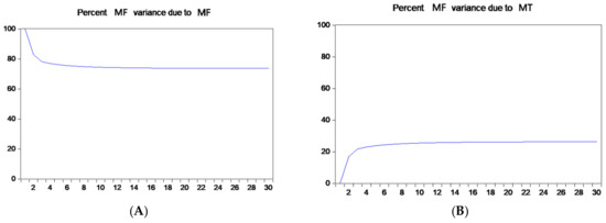 It can be seen from Figure 3B that MT increases slowly during the first eight periods in terms of its impact on MF, and MT has an economic impact on MF. The impact reaches its highest point in the eighth period, where the hysteresis slowly weakens and approaches zero. Thus, MF plays a substantial role in promoting MT within a short period of time. In the long run, the impact of MF on MT tends to be stable, because the MT market and consumer demand cannot immediately promote the growth of MF. A specific time course is necessary, so a time lag exists. Hence, the H1 has been verified.