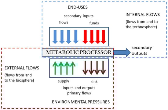 MuSIASEM’s accounting framework is based on Georgescu-Roegen’s flow-fund model [] and relational biology [,]. According to convention, flows are defined as elements that either disappear (‘enter into a process’—inputs) or appear (‘come out of it’—outputs, useful products and wastes) in the timeframe of the analytical representation. Fund elements, on the other hand, are elements that enable the metabolic conversion; they preserve their identity throughout the selected time period [,]. Thus, the funds define the size of the elements by describing “what the system is made of”, whereas the pattern of flow-fund relations defines the level of metabolic activity by describing “what the system does”. Funds as well as flows that are aggregated over a defined period are categorized as extensive variables; they reflect societal features related to the size of the metabolic process. On the other hand, flow-fund ratios are intensive variables (benchmarks) and represent qualitative characteristics of metabolic elements, i.e., the metabolic rate in time (e.g., J of the energy carrier consumed per h of human activity) and metabolic density in space (e.g., kg of crops produced per ha of land).
