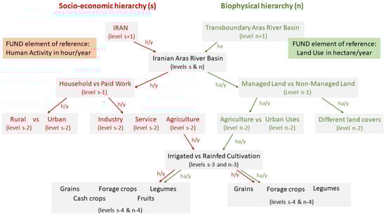 In semi-arid countries such as Iran, with an actual water usage (96 billion cubic meters (BCM) per year) that exceeds the renewable water and water scarcity thresholds by, respectively, 8% and 80% [,], it is important to evaluate nexus security at the river basin scale [,]. Hence, in the present study, the focal level was the Iranian ARB region: level s within the socio-economic sphere, and level n within the biophysical sphere, see Figure 3. These two non-equivalent spheres (s and n in Figure 3) provided the contexts for evaluating the findings of the analysis carried out at the lower levels. Within the socio-economic sphere, our quantitative analysis was based on flow-fund benchmarks per hour of human activity (considering the secondary inputs and outputs to study attributes relevant for socio-economic analysis), whereas, within the biophysical sphere, the quantitative analysis was based on flow-fund benchmarks per hectare of land use (considering primary inputs and outputs to study attributes relevant for ecological and hydrological analysis).