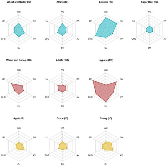 Multi-criteria characterization of the performance (per ton crop output) of the main crop typologies in the IARB. The abbreviations IC and RC in the graph titles stand for irrigated and rainfed cultivation, respectively. The abbreviations WC, HA, AV, EU, GHG, and LU on the spider diagram axes stand for, respectively, water consumption, human activity, added value, energy use, GHG emission, and land use. Data refer to 2006 (data source: IWWA []).