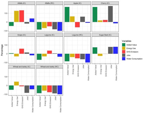 Multi-criteria characterization of the performance (per hectare of cultivation) of the main crop typologies in the Iranian Aras River Basin. The abbreviations IC and RC in the graph titles stand for irrigated and rainfed cultivation, respectively. Data refer to the year 2006. Data source: [].