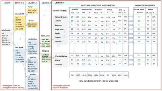 On the left side of Figure 6, we describe the metabolic pattern of the overall IARB and its main socio-economic sectors (lower-level compartments n, n − 1, and n − 2) using the fund element human activity (in hours) to assess compartment size (as is typical in MuSIASEM). The left side of the dendrogram thus provides a contextualization of the agricultural activities in relation to the socio-economic characteristics of Iran. However, going down to level n − 3, on the right side of the dendrogram, when describing the metabolic pattern within the agricultural compartment, the logic of the accounting was changed. To focus better on the biophysical limits and potential environmental impact, the fund element used to measure the relative size of the various functional components (i.e., the different supply systems of crop commodities) from level n − 3 downward was land use (measured in ha). As a result, the right side of the figure shows a matrix of which the horizontal vectors (rows) can be used to generate mutual information (i.e., the “sudoku effect” []). In this way, one can aggregate the metabolic profiles of crop and cultivation technologies across different levels of analysis (local production processes, supply systems operating in specific areas, and eventually to the whole agricultural sector of Iran). Note that the accounting of the different crop types illustrated in Figure 6 observed closure at the level n − 4 (e.g., the land in production for apple, grape, and cherry adds up to the total land of the category “fruits” in the dendrogram).