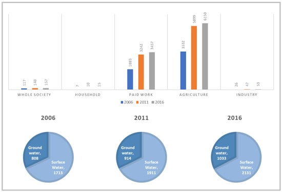 At the level of the Iranian ARB (level n), energy (EMR) and water intensity (WMR) increased from 9.24 to 11.04 MJ/h (19% increase) and 117 to 157 L/h (34% increase), respectively, over the 10-year period 2006–2016 (see Table A1 in the Appendix A and Figure 7). It being the most limiting factor, in Figure 7, we detail water use in the IARB for levels n, n − 1, and n − 2. Note that we considered only blue water, i.e., the water appropriated and controlled by humans for irrigation, industrial, and domestic uses. Most of the blue water consumption is associated with agricultural activities (94%, 92%, and 90% for years 2006, 2011, and 2016, respectively). Of the water withdrawal in the agricultural sector, 68% was obtained from surface waters and 32% from underground waters (Figure 7). These percentages remained constant over the period considered. Note, however, that official water withdrawal numbers may be underestimated, as [] observed that the number of 650 thousand wells extracting water from aquifers in Iran had illegally increased by 1200% over a period of 40 years.