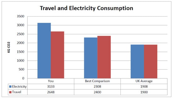 Participants were given a figure that illustrated their electricity consumption and their travel (kg CO2) simultaneously based on the figures calculated, and they were asked to comment on this. Therefore, participants were given a graph that compared the participant to the best comparison scenario (electricity consumption for a similar-sized house and South East England travel average) and the UK average based on the figures explained earlier. They were asked to explain their reaction to the feedback. Sample graphs are displayed in Figure 5 and Figure 6.