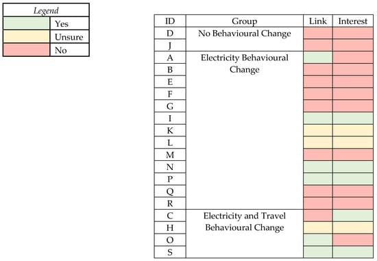 Figure 7 highlights whether participants saw a link between household electricity and travel and whether participants were interested in feedback on their travel (red indicates no, yellow indicates unsure, and green indicates yes). The findings are categorised according to the amount of behavioural change identified over the course of the study, of which there were three categories: