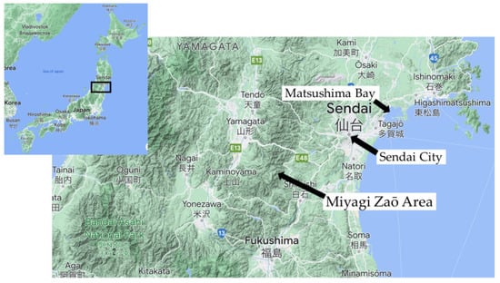 Figure 1. Location of the Miyagi Zaō Mountain Area [40]. Note: Sendai city and Matsushima Bay are regional destinations that compete with the Miyagi Zaō Mountains Area.