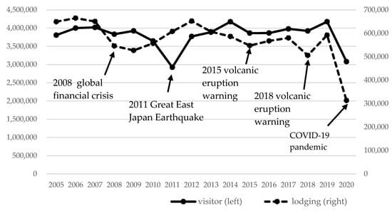 Figure 2. Number of People to Visit to and Lodge in the Miyagi Zaō Mountain Area. Drawn by the Authors Based on [41,43].