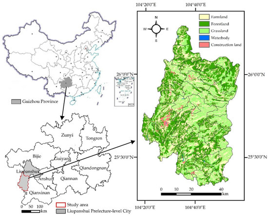 At the junction of Yunnan and Guizhou, Panzhou city (104°17′–104°57′ E, 25°19′–26°17′ N) in western Guizhou Province is a part of Liupanshui prefecture-level city. As an important node for transportation, energy, commerce, logistics, and tourism between Yunnan Province and Guizhou Province, it has jurisdiction over six subdistricts, fourteen towns, and seven townships, with a total area of approximately 4057 km2 (Figure 1). This area has a subtropical plateau monsoon climate with a mean annual temperature of 15.2 °C and an annual precipitation of 1390 mm. Panzhou city has karst landforms, with plateau mountains as the main body. The whole terrain is high in the northwest, low in the southeast, and uplifted in the central and southern parts. The forest coverage rate reaches 46.69%, with a dense distribution of rare animals and plants (e.g., millennium ancient ginkgo trees). There is a large coal reserve, accounting for 15% of the total coal reserve in Guizhou Province. However, due to the typical karst geomorphological characteristics, rapid urbanization and industrialization have made the ecological systems more fragile (e.g., soil erosion and rocky desertification), which has restricted regional development.