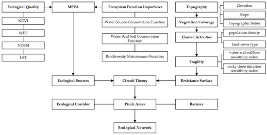 Located in southwestern China, Panzhou city is a typical karst county in Guizhou Province. Like other county-level regions in China, it has faced the problem of ecological degradation originating from rapid development over the last few decades. Furthermore, as one of the most prominent karst landform areas, it also has confronted notable pressure to balance its ecological protection and economic growth. However, its vulnerable ecosystem provides a distinctive landscape and necessary habitat for rare plants and animals, which can contribute to the ecotourism industry, one of the province’s predominant economic services. Despite its profound ecological advantages or disadvantages, research work on ecological security patterns and the construction of an ecological network in karst areas has rarely been explored in the literature. Therefore, in this study, ecological quality (EQ), ecosystem function importance (EFI), and morphological spatial pattern analysis (MSPA) were assessed, and the ecological sources were identified according to the superior importance of the EQ, EFI, and MSPA, respectively. Using topography, vegetation status, human activities, and quantitative indexes, the resistance surface was established, and the circuit theory was applied to identify ecological corridors and specific nodes. Thus, the objectives of this study were as follows: (1) to extract the ecological source of Panzhou city based on multiple objectives, (2) to construct the ecological network pattern of Panzhou city, and (3) to optimize the ecological network. The outcomes of this study may not only enrich the currently existing research on ecological security patterns and the construction of an ecological network in ecologically fragile areas, but they may also provide suggestions for safeguarding both ecology and economic development.