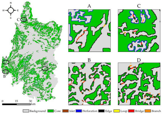 Depending on land-use data with a 30 m × 30 m spatial resolution for Panzhou, forestland was set as the foreground in the MSPA method, while other land cover types (farmland, grassland, waterbody, and construction land) were set as the background. Then, using the eight-neighborhood analysis method and the Guidos Toolbox software 3.0 (https://forest.jrc.ec.europa.eu/en/, accessed on 31 May 2022) [62], the edge width parameter was set to 1 (a reference to the radius of a circle with an area of 1 hectare), and the particle size was set to 30 m for MSPA.