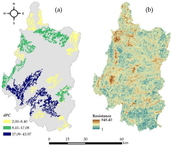 The dPC value was calculated, and patches with a dPC less than 2 were removed. A total of 26 patches were identified as ecological sources. The total area of the ecological sources was 1007.74 km2, accounting for 24.84% of the study area. Using the natural breaks, the ecological sources were divided into three classes, in which higher values indicated more important locations, as shown in Table 5 and Figure 6a. The number of patches where the dPC was greater than 17.09 was low, indicating that a few patches in the study area significantly impacted the overall connectivity relative to the patches where the dPC was less than 8.40. In terms of land cover types, most of the ecological sources were composed of forestland, grassland, and water bodies. Among them, the forestland type sources were concentrated in the northern, western, and south-eastern regions of the study area, including the state-owned Forest Farm of Dengjiawan and the state-owned Forest Farm of Bajiaojing and Niangniang Mountain. The grassland-type sources were mainly located in the northern region, that is, the Wumeng Prairie and the Poshang Prairie. The water area type sources were distributed in the south, which is a tributary of the Nanpan River of the Pearl River system.
