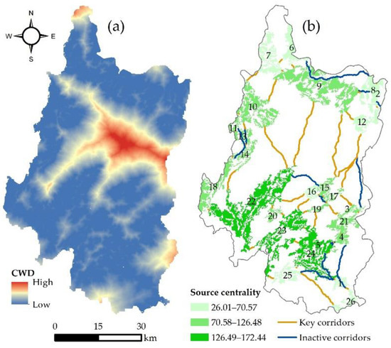 Minimum cost-weighted distance (a) and source centrality and ecological corridors (b).