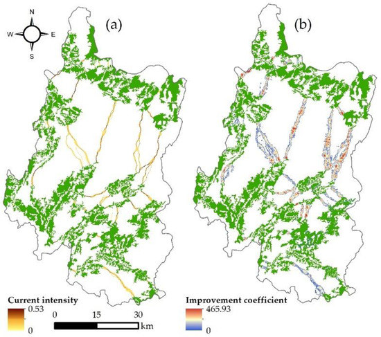 Pinch areas are active areas between ecological sources that play important roles in maintaining the connectivity of regional ecosystem service security patterns [16]. As shown in Figure 8a, high current intensity represented a high density of species migration and vice versa. Because the quantity of the current flowing through the patch section was the same, the density of the current in the narrow pinch area was relatively higher. There were three pinch areas with a high current intensity between the northern and middle regions. Such areas provided the basic corridors for species migration between the northern and the middle parts of the study area. The middle part was the region where pinch areas were concentrated. Although the ecological sources in such parts were comparatively small, they became ‘the transit stations’ connected by the pinch areas with moderate current intensity. The southern and western regions had fewer pinch areas and lower current intensity. The pinch areas in these regions connected the ecological sources at the administrative boundary and played key roles in the species migration to the south and west of Panzhou city. The total area of pinch areas was 82.76 km2, accounting for 2.04% of the study area, including 23.37 km2 of farmland, 27.16 km2 of forestland, 31.96 km2 of grassland, 0.05 km2 of water bodies, and 0.22 km2 of construction land.