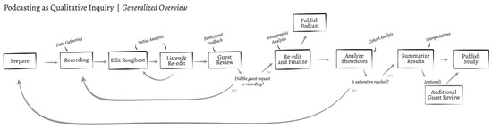 Podcasts have been increasing in popularity for a number of decades now and this popularity is projected to increase further by up to 25–30% annually [49]. Inspired by this popularity, the potential of podcasts as a method, particularly in ethnographic research, has been explored by a variety of scholars (e.g., [50,51,52]). Reasons for these explorations include the following: (1) increased accessibility of research [53,54], (2) inclusion of more non-formal data (sub)cultures [51], (3) and as a geographic research tool [55]. A relatively large subset of podcast-based research includes the usage of podcasts as pedagogical-didactical tools (e.g., [56,57]). These uses of podcast-based inquiry have so far been partial (e.g., using existing podcasts as data or creating podcasts as an output of research). Podcast-based inquiry (see Figure 1) with the intention of simultaneously gathering data and creating output was not identified in the literature.