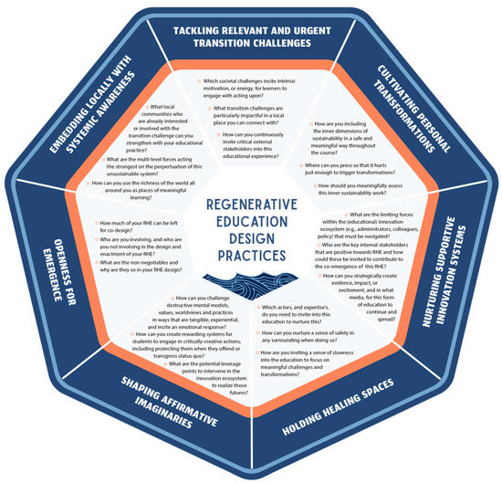 The preliminary REDPT presented below (Figure 3) can be used, together with Table 1, by practitioners to (re)design their own RHE. This preliminary tool emerged through several rounds of iterations on paper conducted by the main author. The practises considered as an educator form the outer ring of the REDPT, while the different design questions that may help you engage with this design practise can be found in the tool. The design tool has been inspired by other examples of design-based templates and tools such as the Business Model Canvas [67], the triple layered business model canvas [68], the Circular Business Model Innovation Tool [69] and the Biomimicry design lens (Biomimicry Institute 3.8) [70]. In subsequent work, the authors will work towards validating and further iterating on the REDPT towards a guide for practitioners, including a full description of how the final tool and guide have been developed and can be used.