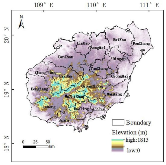 Hainan Province (18.80°–20.10° N, 108.37°–111.03° E) is located at the southernmost part of China, with a land area of about 35,300 . It is dominated by plains and platforms, exhibiting the geomorphic characteristics of high elevations in central Hainan Island and low elevations at the coast, with an average altitude of 120 m, as shown in Figure 1. Hainan Island has a typical tropical monsoon marine climate, with an annual precipitation of 1000–2600 mm [32]. It has an obvious rainy season and a dry season, and the annual average temperature is 23.8–26.2 °C. There are three major rivers on Hainan Island: Nandu River, Changhua River, and Wanquan River. Together, their drainage areas account for about 47% of the total of Hainan Island. The forest coverage rate of Hainan Province is as high as 62.1%, at the forefront of the country. With 1944 km of coastline, Hainan Island is rich in tourism resources. In order to promote the construction of a national ecological civilization pilot area, the red line area of ecological protection will not be less than 27.3% of the land area of the whole province.