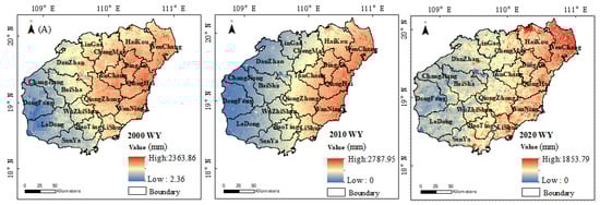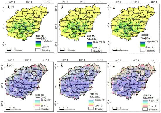 Obvious spatiotemporal heterogeneity was found in the three ecosystem services in Hainan Province. From the perspective of quantity, the water yields in 2000, 2010, and 2020 were 56.13 billion m3, 42.06 billion m3, and 28.91 billion m³, showing a trend of continuous decline (Table 3). The water yield is affected by the landform, climate and hydrology. It is mainly affected by precipitation and potential evaporation; the precipitation levels in Hainan Province in 2000, 2010, and 2020 were 2153 mm, 2138 mm, and 1987 mm, respectively, and exhibited a continuous downward trend. The potential evaporation is 1117 mm, 1778 mm and 1718 mm, respectively. There is heavy precipitation and low potential evaporation, which leads to the difference in the temporal change of the water yield. From the perspective of space, the water yield in the east was higher and gradually decreased to the west, in which the cities of Qionghai, Wenchang, and Wanning had the higher water yields (Figure 2A). Due to the large amount of precipitation and relatively weak evapotranspiration in the eastern region, the precipitation in the western region is relatively low. The land use intensity and spatial distribution characteristics of soil attributes also lead to the strong spatial heterogeneity of the water yield. Soil conservation in Hainan Province was , and in 2000, 2010, and 2020, respectively, showing a trend of first rising and then declining (Table 3). In 2002, Hainan Province implemented the Grain for Green Program, giving priority to the return of farmland to forests in the soil erosion area in the middle of Hainan Province and desertification areas in the west of Hainan Province. Therefore, soil conservation showed an upward trend. In 2018, the Chinese central government proposed to establish the China (Hainan) Pilot Free Trade Zone in Hainan, and a large amount of construction land expansion occupied the original forest land and cultivated land, resulting in a downward trend in soil conservation. The areas with high soil conservation were mainly located in the central part of Hainan Province, such as Wuzhishan city and Qiongzhong city (Figure 2B). The regional precipitation was more abundant and the rainfall erosion was higher than in the northwest, but due to the higher vegetation coverage in the area, the soil conservation capacity was strong. The soil conservation areas were distributed in the northern part of Hainan Province, and the changes in soil conservation from 2000 to 2020 were not obvious. The carbon storage of Hainan Province was , and in 2000, 2010, and 2020 respectively, showing a decreasing trend (Table 3), but the overall rate was relatively slow. High carbon storage values were found in the interior of Hainan Island, such as in Wuzhishan city and Qiongzhong city (Figure 2C), while the amount of carbon storage in the surrounding areas was relatively low. The reason for this finding is that more arable land and forests are located in the interior of Hainan Island, significantly enhancing the carbon sequestration, while the periphery contains more cultivated land, building land and water areas. The aboveground carbon density of cultivated land is low, and the carbon density of water areas is 0 where the amount of carbon storage is relatively low.
