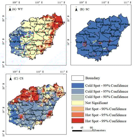 Distribution of ecosystem service hot spots in 2020. (A) water yield (WY), (B) soil conservation (SC), and (C) carbon storage (CS).