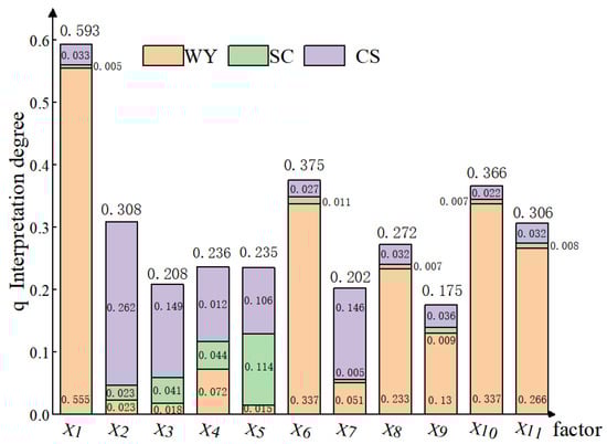 The degree to which the drivers explain the differences in ecosystem services in 2020. WY: water yield; SC: soil carbon; CS: carbon storage; X1: precipitation; X2: normalized difference vegetation index; X3: net primary productivity; X4: digital elevation model; X5: slope; X6: cultivated land area; X7: population; X8: gross domestic product per capita; X9: land use degree; X10: urbanization rate; X11: overnight tourist population.