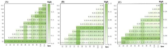 From the perspective of a single ecosystem service, the amount of regional precipitation directly affected the water yield. Therefore, precipitation had the most impact on the water yield service (0.555). When there was little change in precipitation, the slope affected the water yield capacity. The greater the slope, the poorer the water yield effect. Therefore, the contribution rate of the slope to water yield services was low (X5, 0.072). The degree of land use represented the development level of a region, and its factor interpretation of the water yield services was second only to precipitation (X9, 0.337). Therefore, when considering the construction of a new urban area, planners should also focus on protecting the environment. With the continuous development of Hainan’s tourism industry, the interpretation of the water yield services by the number of overnight tourists was 0.266 (X11). This finding indicates that the government needs to develop ecological tourism according to local conditions during the future development process. The DEM interpretation of the soil conservation service was the greatest (X4, 0.114). The areas with strong soil conservation functions were mainly concentrated in areas with high altitudes and high slope changes in the central part of Hainan Province. In general, the contribution rates of various factors to the soil were relatively low, indicating that the influencing factors of soil conservation services were more complicated. The contribution of the NDVI (X2) to carbon storage was 0.262, and areas with high NDVI values were generally areas with high vegetation coverage, so the amount of carbon was high. The per capita GDP (X8) had a secondary impact on carbon reserves of 0.146, indicating that in the process of rapid economic development, population increases lead to increases in construction land and decreases in the vegetation area. The relationships between ecosystem services should be considered in planning and development.
