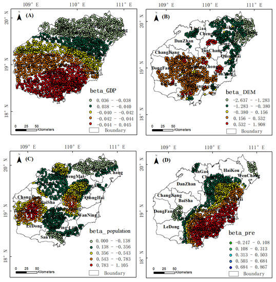 On the whole, the spatial response relationships between the DEM, population, and precipitation and water yield were more obvious (Figure 6), while the response relationship of the GDP was relatively weak, and its coefficient ranged from 0.036 to 0.045, exhibiting a decreasing trend. The elevation had a significant negative correlation in the north of Hainan Province, indicating that the lower the elevation, the lower the water yield. In central Hainan Island, the opposite result was found. The reason may be that Wuzhishan city, Qiongzhong city, and Baoting city are located at higher elevations, and are less affected by human activities. Therefore, the water yield effect is obvious in the areas with higher altitudes, and the results were reversed in northern Hainan Province, especially in areas with lower elevations. Areas such as Haikou city have a high intensity of human activities, thus affecting the service function of the water yield. The effect of precipitation on the spatial heterogeneity of the water yield in Hainan Province showed a decreasing trend from southeast to northwest, indicating that the precipitation increased by 1 mm and the average water yield depth increased by 0.284 mm.