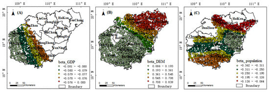 Overall, the correlation coefficient between the effects of the DEM and population size on carbon storage services was relatively high (Figure 7), with a clear circular structure. The response relationship of the GDP was weak; its coefficient ranged from −0.081 to 0, and only the southeastern part of Hainan Province passed the significance test of 0.05. Spatially, the impact of GDP on carbon storage increased from southwest to northeast. The coefficients of the DEM ranged from 0.086 to 0.839, and its spatial response was similar to that of GDP. The spatial response of the population to carbon storage was high in the southern regions. The reason may be that the rapid economic development and large population in the northern and southern regions have led to the increase of construction land and cultivated land, thereby significantly impacting carbon storage. The central area of the island has a higher elevation, a relatively weak land use change trend, and a relatively weak spatial response to carbon storage.