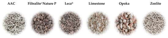 In this study, six different P RMs were used in the tests: Autoclaved Aerated Concrete (AAC), Filtralite® Nature P, lightweight expanded clay aggregate (Leca®), limestone, opoka, and zeolite. AAC is a lightweight popular material used in civil engineering made of quartz sand, lime, or cement and water as a binding agent. Filtralite® Nature P is high-quality filter media manufactured from expanded clay material heating above 1000 °C, used for filtration and purification with an active surface of dolomite addition (www.filtralite.com). The Leca® is a lightweight construction material used in civil engineering, geoengineering, agriculture, horticulture, and environmental protection (www.leca.pl). Limestone is a sedimentary rock composed mainly of the skeletal fragments of marine organisms. Opoka is a calcium silicate sedimentary rock heated at a temperature of 900 °C. Zeolite is a hydrated aluminosilicate mineral that contains alkali and alkaline earth metals. The photographs of tested materials are presented in Figure 1.