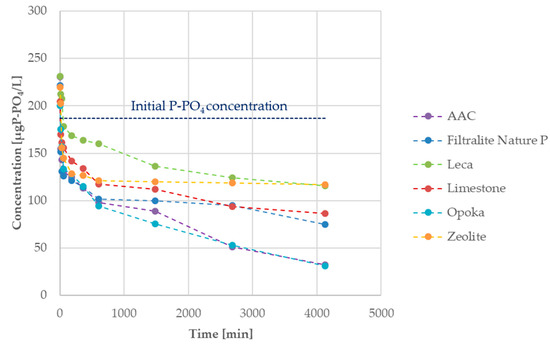 Removal of P-PO4 onto tested materials was strongly affected by the contact time of the materials with surface water and increased with prolonging the time (Figure 2). The retention time was previously widely examined by kinetic studies and is regarded as one of the most influencing sorption agents [39,40,41] and this is also observed in recent research. The initial concentration of P-PO4 in each sample was 186.59 µg P-PO4/L. During the first 5 min of contact time, there is observed desorption of P-PO4 in the case of all tested RMs. After this time, most of the materials began to sorb P-PO4, except for zeolite (desorption lasted 15 min) and Leca®, when the desorption process lasted for 30 min of contact time. Releasing P-PO4 during the first minutes of RMs contact time with surface water may be caused by decreasing equilibrium concentrations of Ca2+, P-PO4 species, and/or OH− ions in solution, which leads to calcium phosphates dissolving [40]. Karczmarczyk et al. [60] tested 29 materials of natural or artificial origin for P-PO4 release. P-PO4 was detected in most of the extracts of materials. Most of them are popular building materials used in infiltration facilities (sand, gravel) or as P RMs (limestone, lightweight aggregates, crushed red brick). In field conditions, in the case of Ca-rich materials, the release of P is likely to occur when the solution pH decreases, for example, due to reduced delivery of hydroxide ions from the material (in aged filters) or during increased water flows [40]. For Fe/Al hydroxide, the P sorption is partly reversible when a P group replaces a hydroxyl group on the metal hydroxide surface (i.e., a monodentate complex) [40,61].