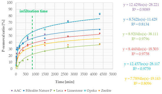 The data of equilibrium concentrations (Figure 2) were recalculated by Equation (16) to the P-removal ratio. The results were fitted to the logarithmic function with R2 ranging from 0.8096 to 0.9796 (Figure 3). The infiltration time T, calculated according to Equation (14), is around 14 h. Reading the time T from Figure 3, we are able to calculate the P-PO4 removal by tested RMs during the infiltration time is: 55, 47, 22, 38, 54, and 35% for AAC, Filtralite® Nature P, Leca®, limestone, opoka and zeolite, respectively. These correspond to the decrease of P-PO4 concentration to: AAC (84 µg/L) > opoka (86 µg/L) > Filtralite® Nature P (99 µg/L) > limestone (116 µg/L) > zeolite (121 µg/L) >, Leca® (146 µg/L). The limit concentration above which water is exposed to eutrophication equals 0.1 mg P-PO4/L [14] or good ecological status (0.101 mg P-PO4/L [59]) is completed only for AAC, opoka, and Filtralite® Nature P.