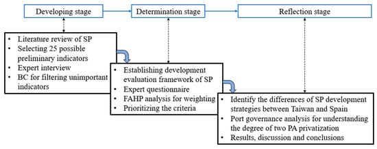 Although there are some studies on SPD [6,7,10,11,12], the definition of SP varies from country to country, and the existing studies on SPD may not meet the needs for Taiwan’s ports [7,12]. Thus, this study aims to first develop an evaluation method of SPD for Taiwan’s ports using the Borda count (BC) and fuzzy analytic hierarchy process (FAHP). Secondly, we aim to compare the main criteria for SPD obtained from those of the Spanish ports presented by Alberto et al. [6]. This is not only because of the different port management models of the Taiwan Port Authority (TPA) and the Spanish Port Authority (SPA)—both of which are government-owned, with the management and control of one port being delegated to a local government agency, while the other is managed by a corporatized entity [13]—but also because such a comparison can expand more studies and discussions, such as the differences in port management between European and Asian countries [14], or the differences in PG in a country between a single PA and multiple PAs [15]. In addition, both countries have a long history of ports and works on port development have been widely discussed internationally [11,14,15,16,17,18], so information on port development in both countries is relatively easy to obtain and examine. In recent years, both countries have made a strong push to automate and digitize their ports as an SP [8,19]. Thus, the objective of this paper is to fill the above-mentioned literature gaps with the following two points:
