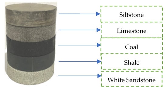All types of coal and rock specimens used in the experiment were processed from large raw coal and rock, and similar specimens were from the same raw coal and rock. Therefore, it was considered that the mechanical properties of the same type coal and rock specimens are roughly the same. The coal and rock specimens were cylindrical and φ 50 mm × 10 mm in size, which ascertained the cleanliness of specimens’ surface during specimen processing and the error was ±0.02 mm. There were five types of coal and rock in the experiment, including coal, siltstone, limestone, shale and white sandstone. The combined coal and rock specimens consisted of five single-layer coal and rock specimens, which were divided into four groups according to different combination sequences which were used in the experiment without confining pressure, as shown in Figure 1. A total of 20 single-layer coal and rock specimens were prepared.