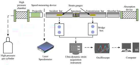 Based on the φ 50 mm SHPB impact test system [23,24,25], as shown in Figure 2, dynamic impact experiments for four groups of multi-layer combined coal and rock mass without confining pressure were carried out, respectively, with an aluminum short-size cylindrical bullet. The impact loading was applied to the coal and rock specimens by driving the air pressure and giving the bullet impact velocity to hit the incident bar; the distance between the bullet and the air pressure point were adjusted to 40 cm, 80 cm, 120 cm, 160 cm and 200 cm, respectively, to obtain different impact velocities.