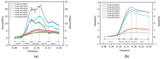 Similarly, the dynamic curves between strain and time under high-velocity impact, as shown in Figure 3b, were also similar and could also be divided into five stages (take the impact velocity of 6.414 m/s as an example):